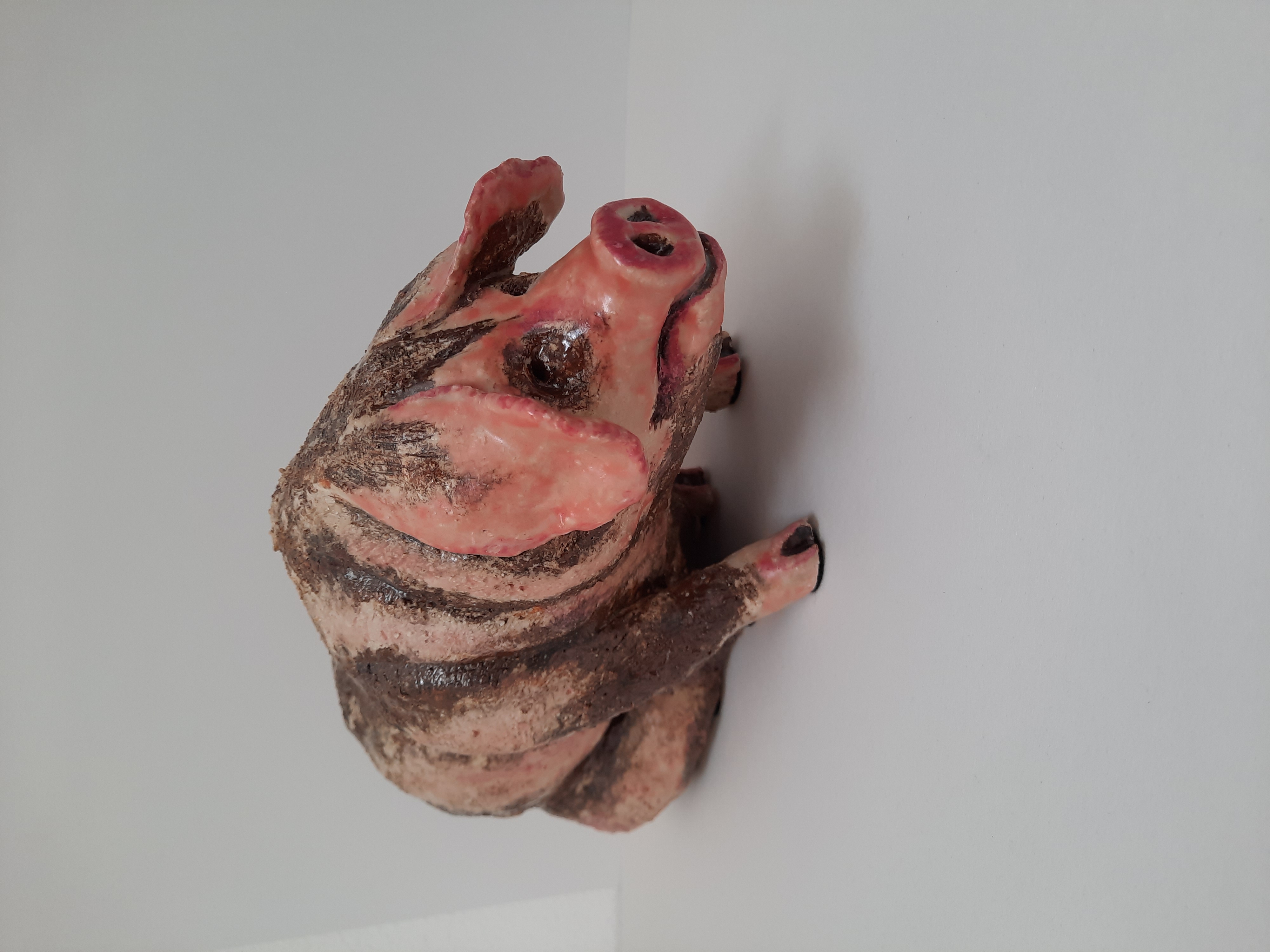 Pork is gemaakt van grove chamotte klei en bewerkt met ijzeroxide en gedeeltelijk met een glansglazuur.