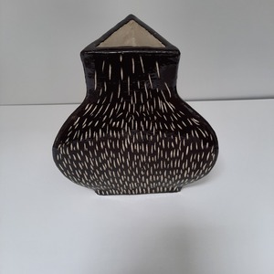 2020Deze vaas is opgebouwd uit chamotte klei en voorzien van een zwarte engobe. Daarna is gedeeltelijk de zwarte bovenlaag weggekrast, waardoor de witte klei weer zichtbaar werd. De vaas is daarna met glansglazuur afgewerkt.