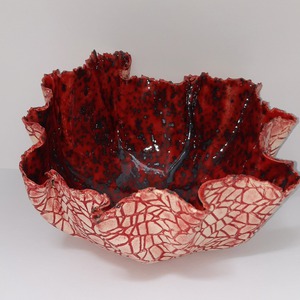 2021Deze schaal is gemaakt van chamotte klei. Aan de binnenkant afgewerkt met een hoogglans glazuur. Aan de buitenkant is het patroon in gewassen met een kleurpigment. Slechts als siervoorwerp te gebruiken.