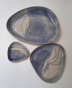 2021De schalen zijn gemaakt van chamotte klei. Aan de binnenkant bewerkt met een oxide en afgewerkt met een hoogglans glazuur. Deze schalen zijn niet geschikt voor vochtig voedsel, maar meer voor presentatie. De afmetingen zijn: 30x23, 20x20 en 10x10