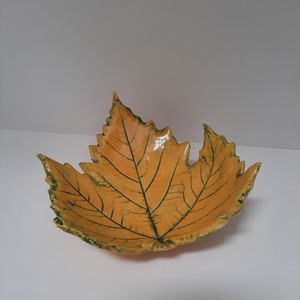 2021Dit schaaltje is gemaakt van chamotte klei. De nerf is gekleurd met een oxide, waarna het afgewerkt is met geel hoogglans glazuur.
