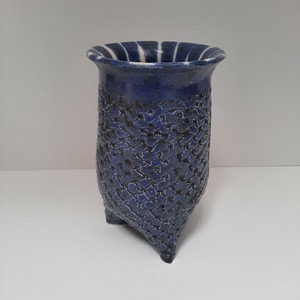 2021Deze ronde vaas staat op drie pootjes en is gemaakt van chamotteklei. Daarna bewerkt met verschillende glazuren. De vaas heeft een middenlijn van 10 cm.