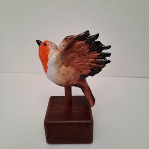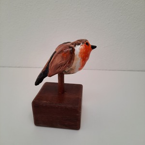 2021Dit roodborstje is gemaakt met chamotte klei en bewerkt met verschillende kleuren glazuur. Staat vast op een houten sokkeltje.