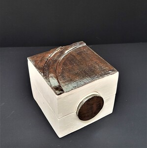 2025Bewaardoosje in donkere klei met wit glazuur.