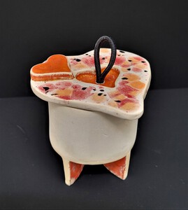 2022Dit dingendoosje is gemaakt van witte chamotte klei . Vervolgens geglazuurd met een Botz effektglazuur, zodat het een zilverachtige kleur heeft gekregen. (ontwerp Caroline Peeters)